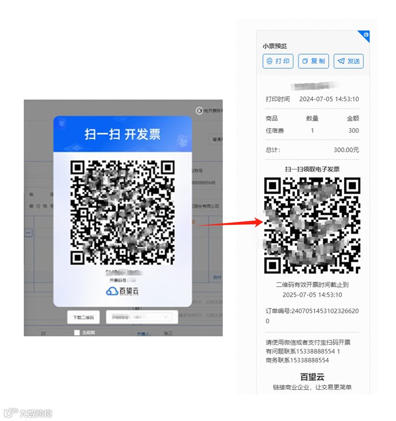 通过【发票填开】或【扫码开票】等方式,生成开票二维码或打印消费小票的方式提供给客户开票入口;