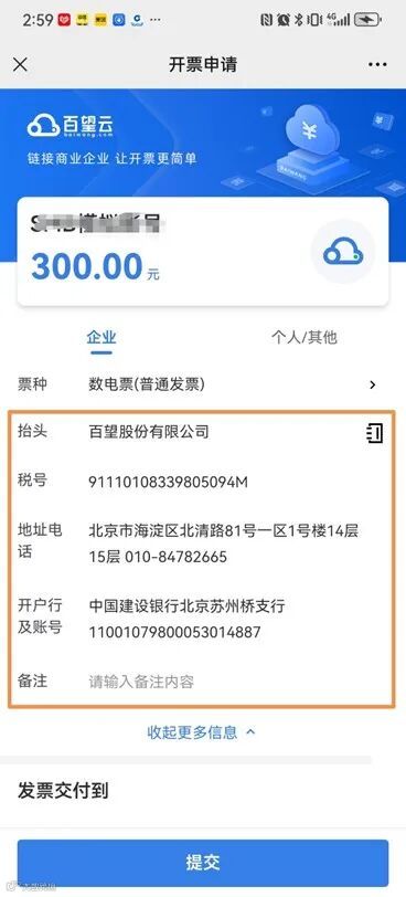 选择相应的企业名称后,企业的税号、地址电话、开户行及账号信息也一并自动带出,客户只需核对即可,然后点击【提交】按钮,发票就开具成功了。