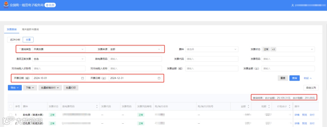 企业可登录电子税务局,并依次点击【我要办税】-【税务数字账户】-【发票业务】-【发票查询统计】-【全量发票查询】模块,然后选择所需要的票种、来源及相应开票日期,就可以统计2024年4季度开票明细了,后面的操作,按照企业实际情况填报即可。