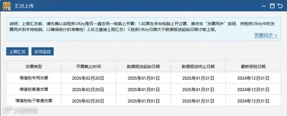3)反写监控:申报成功后,点击【数据管理】-【汇总上传】-【反写监控】,开票截止时间更新到2025年2月20日表示成功。