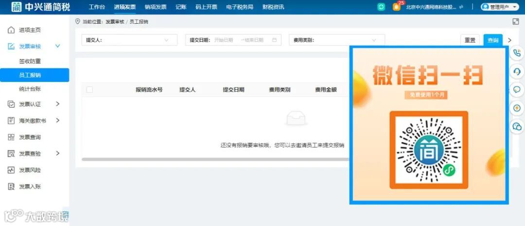 让员工在简税发票夹——自己提交报销材料,财务仅需在中兴通简税“发票报销”界面,一键审核,即可完成报销!感兴趣,可识别下图中二维码去体验一下。