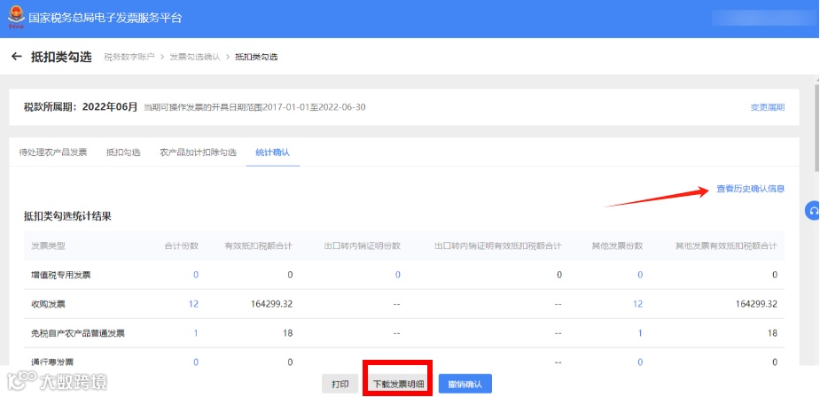 注:若要查询往期数据,可在此页面点击右侧【历史确认信息】进入,选择需要查看的所属月份即可。