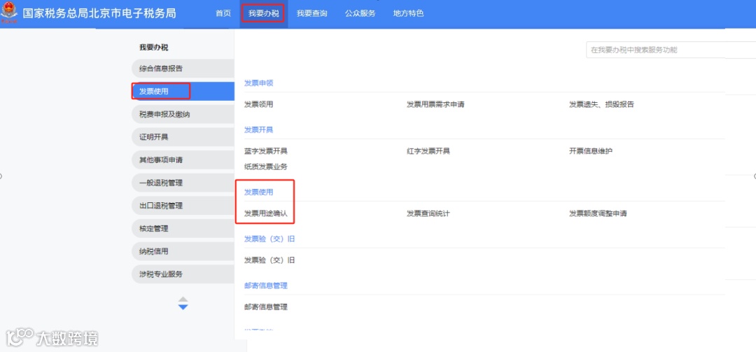 2)也可点击【我要办税】-【发票使用】-【发票用途确认】进入认证界面;