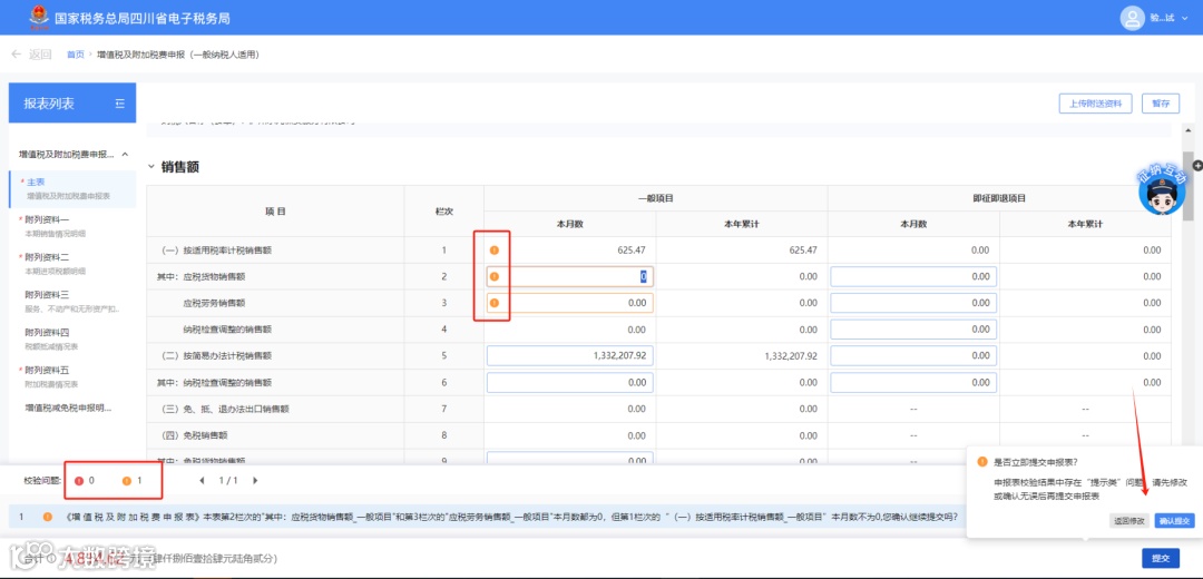 注:表单校验不通过时,警示显示黄色(橘色),纳税人根据实际情况返回修改或忽略继续申报;若警示显示为红色,则说明需要修改后才能进行申报;