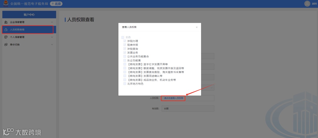 2)若查看当前登录身份是办税员、开票员仍有此问题的,可进入【账户中心】-【人员权限查看】模块,点击“请点击查看人员权限”查看当前权限(图2),若未勾选发票业务,则需要以法人/财务负责人身份登录修改添加权限,操作如下: