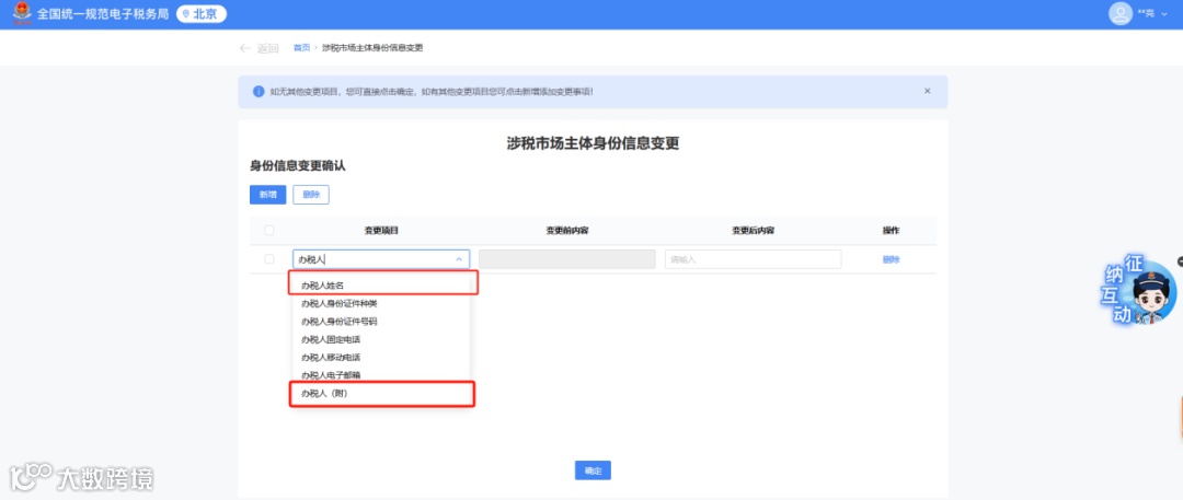 注:选择“办税人”变更的主办税人的相关信息,选择“办税人(附)”变更的附办税人的相关信息