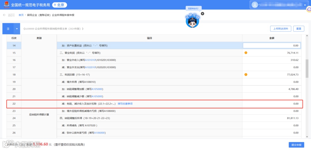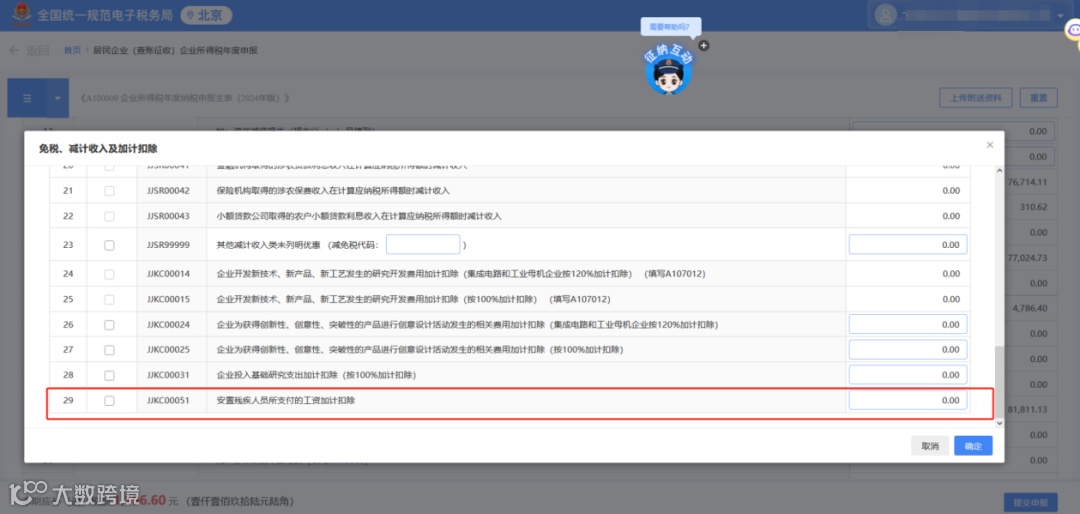 解决办法:现在在《A100000 企业所得税年度纳税申报主表》第22点击蓝色字体“填写优惠事项”(图1)会弹出【免税、减计收入及加计扣除】小表(图2),第29行为安置残疾人员所支付的工资加计扣除。