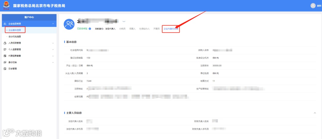 注意:若当前人员有多重身份,则可直接点击【企业内身份切换】切换至其他身份,否则退出后使用其他人员身份登录或给当前人员添加其他身份后重新登陆;
