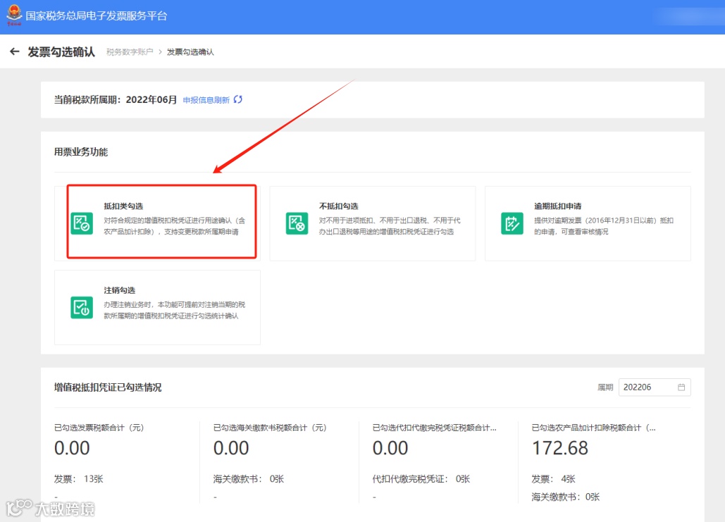 1)在新版电子税务局首页”热门服务”下“税务数字账户”模块直接点击【发票业务】(也可以直接点击【发票业务】),进入后在用票业务办理下点击【发票勾选确认】,进入后选择【抵扣类勾选】即可进入认证界面;