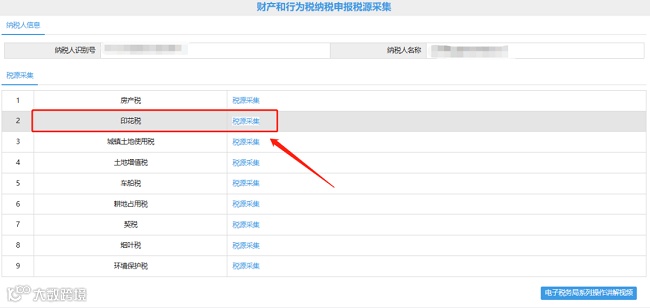 进入“财产和行为税纳税申报税源采集”模块后,点击“印花税”后方【税源采集】,进入印花税税源采集界面,如下图所示;