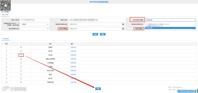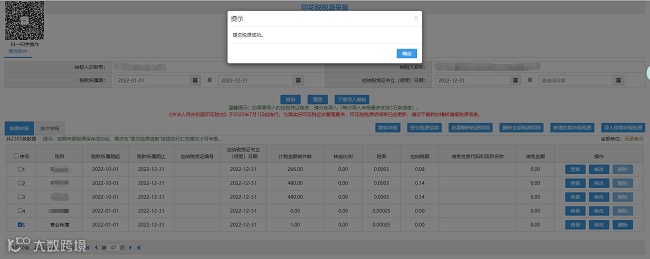 新增税源信息保存成功后系统自动返回按期申报界面,根据查询条件,选择税款所属期 2022年1月1日至2022年12月31日后点击【查询】,查到信息后勾选当前需要申报的税源信息后点击右上角【提交税源信息】,提示提交税源信息成功后点击【确定】;如下图: