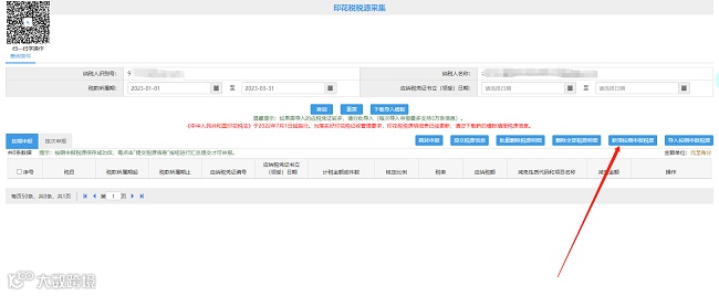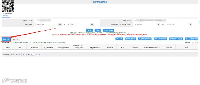 进入印花税税源采集界面后点击左上角【按期申报】,进入印花税按期申报采集界面如下图: