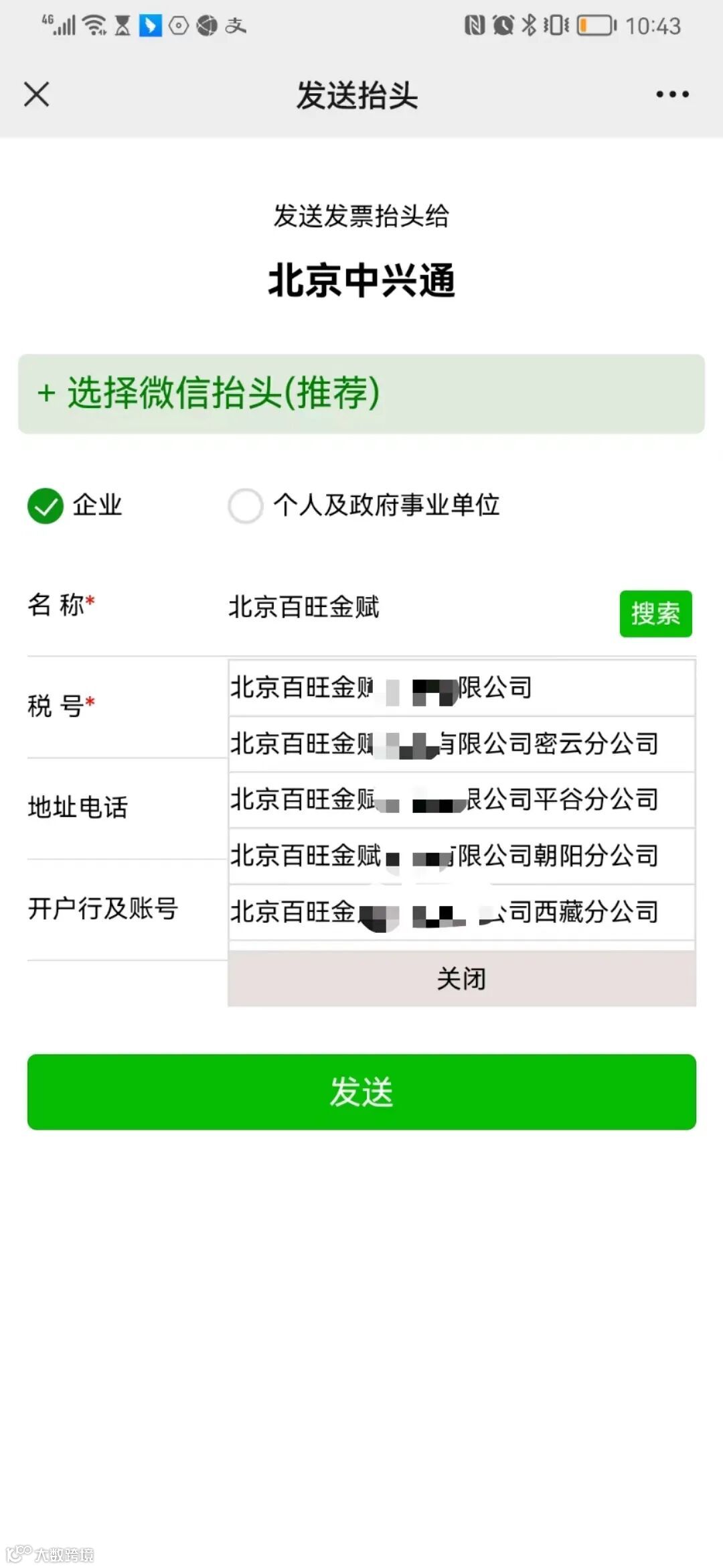 注:输入企业名称关键字,可智能匹配完整开票抬头(名称、税号)