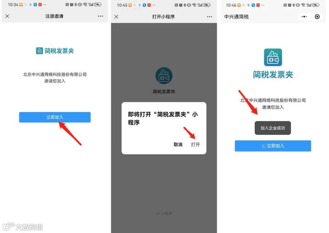 员工在微信中点击【邀请消息】中链接,点击【立即加入】——进入【简税发票夹】小程序——确认【加入】后,看到【加入企业成功】的提示,就可以了。