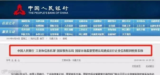 2019年6月26日,中国人民银行、工业和信息化部、国家税务总局、国家市场监督管理总局四部委联合召开企业信息联网核查系统启动会,共同运行企业信息联网核查系统。
