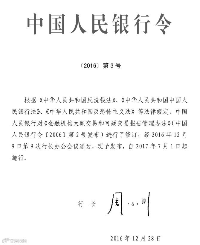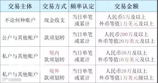 中国人民银行在2017年7月1日施行的《人民币大额和可疑支付交易报告管理办法》(银发[2016] 第3号)中对大额交易进行了定义: