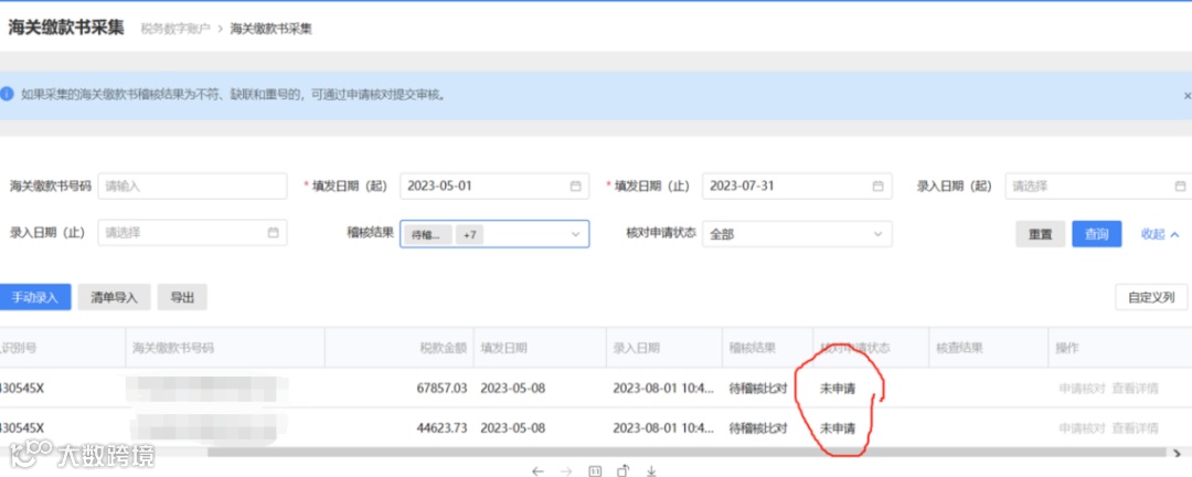 注:对于稽核比对结果为滞留的海关缴款书,可继续参与稽核比对,纳税人不需申请数据核对。
