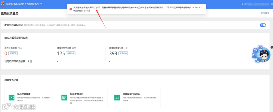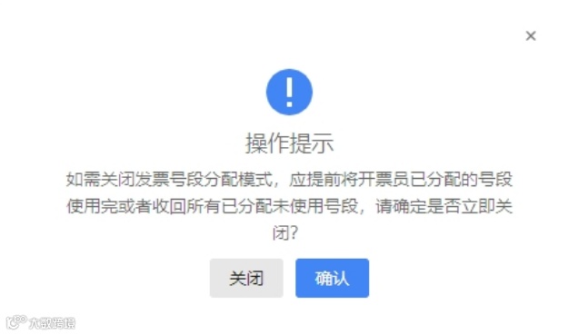 注:发票号段分配模式开启状态下需要将开票员已分配的号段使用完或者收回所有已分配未使用号段后,才可以关闭发票号段分配模式(关闭分配模式时系统会有提示,具体如下图)