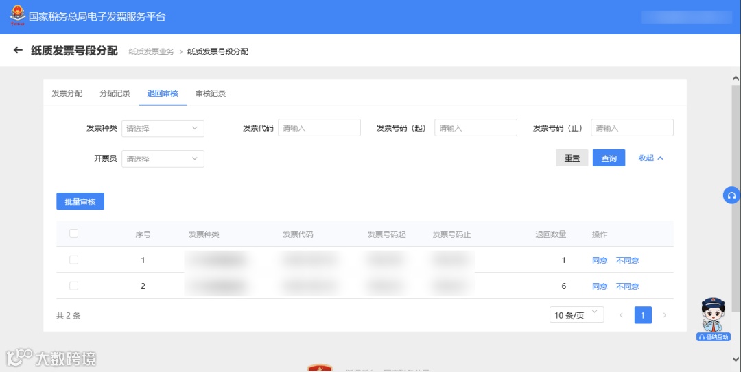 进入【纸质发票号段分配】界面后在“分配记录”模块查询已分配的纸质发票号段,查到数据后点击后方操作栏【退回】(【纸质发票号段分配】模块领票人身份登录可以在分配记录退回,其他身份进入选择“发票退回”标签页操作),然后再由领票人进入“退回审核”模块【同意】即可。
