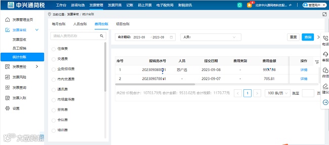 点击【发票管理】→【发票审核】→【统计台账】,点击费用台账,选择住宿费、交通费、业务招待费、室内交通费、通讯费、市场宣传费、劳务费、会议费、培训费其中一项,即可查看相关费用对应的发票台账。