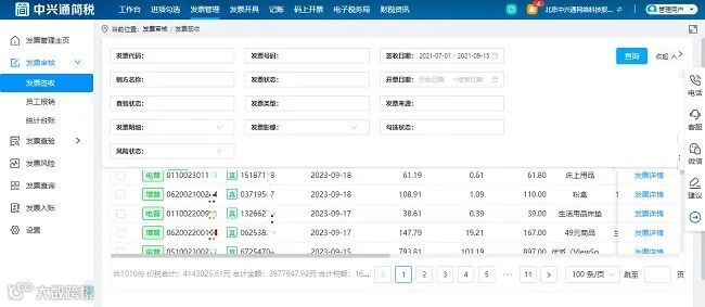 2. 通过筛选发票代码、发票号码、签收日期,销方名称、发票状态、开票日期、查验状态、发票类型、发票来源、发票明细、发票影像、勾选状态及风险状态等,点击【查询】按钮,可以检索出与查询条件匹配的发票查询结果。