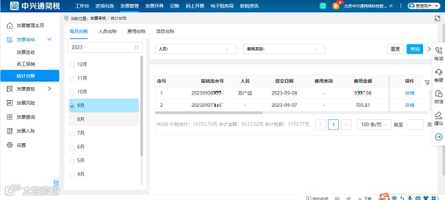 点击【发票管理】→【发票审核】→【统计台账】,点击每月台账,选择年份月份即可查看相关每月发票台账。