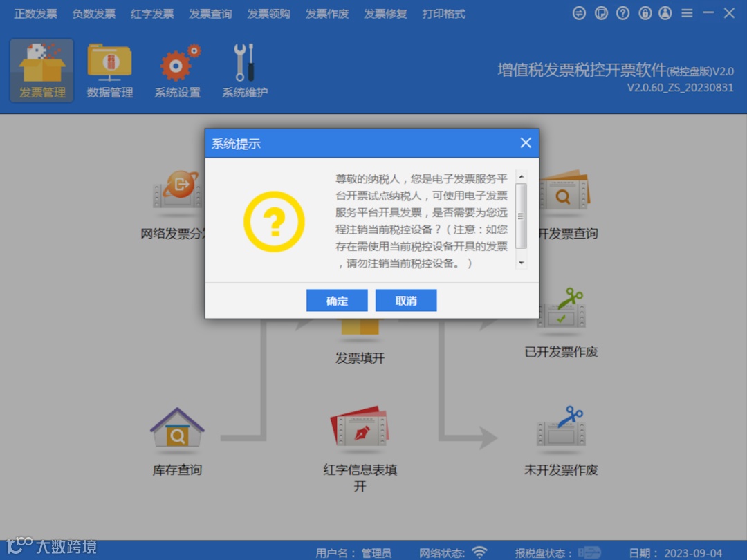 纳税人插入税控盘,联网登陆增值税发票开票软件(税控盘版)(以下简称开票软件),自动查询纳税人是否具备远程注销税控设备资格,进入主页面后,如纳税人具备资格,则自动弹出提示。