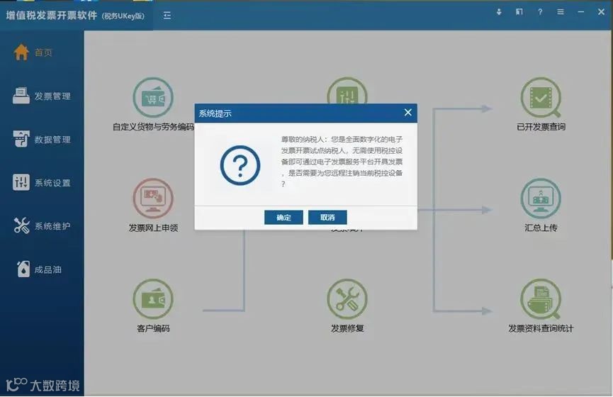 纳税人插入税务UKey,联网登录增值税发票开票软件(税务Ukey版)(以下简称“开票软件”),自动查询纳税人是否具备远程注销税控设备资格,进入主页面后,如纳税人具备资格,则自动弹出提示。