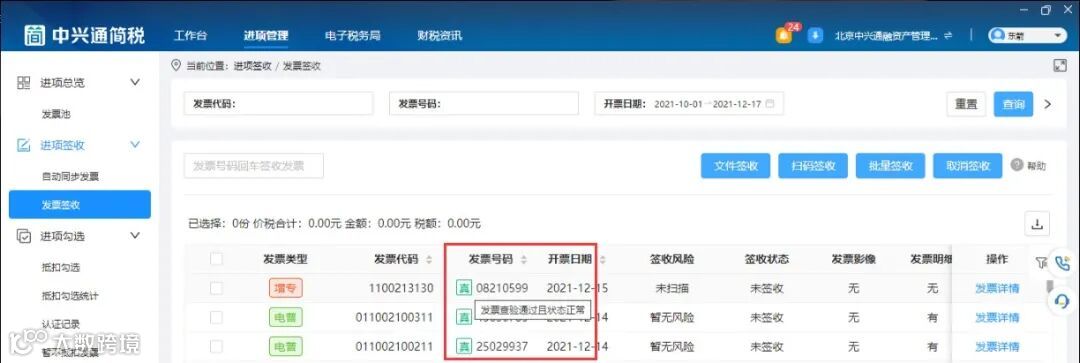注:目前自动查验可以帮助查验发票是否为真票、作废发票、红冲发票,可疑发票,异常发票,每一种查验结果都会有相应图标醒目展示,减少人工筛选行为,大大提升工作效率!