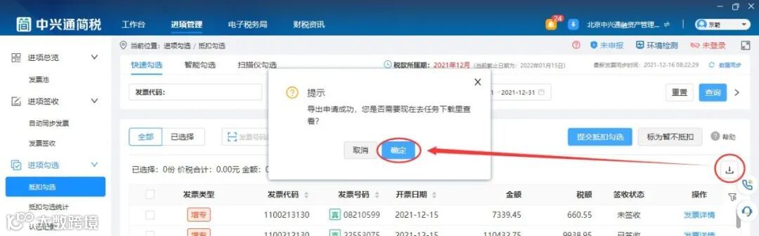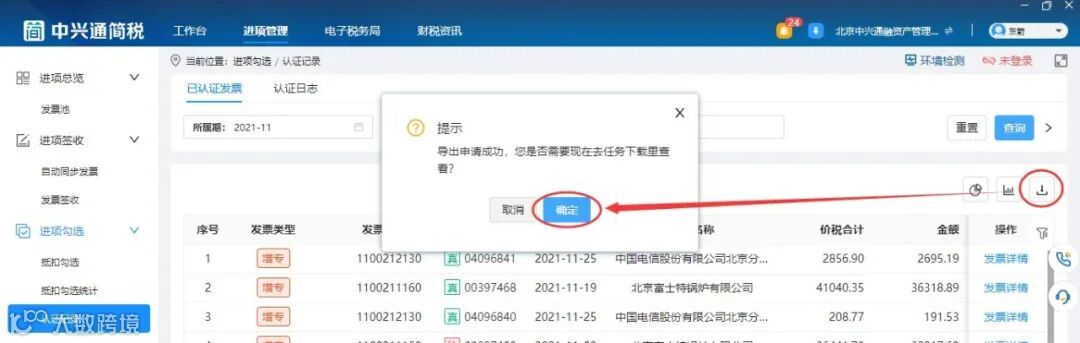 企业可根据需要导出认证结果列表,以便掌握当前已勾选认证的发票情况。