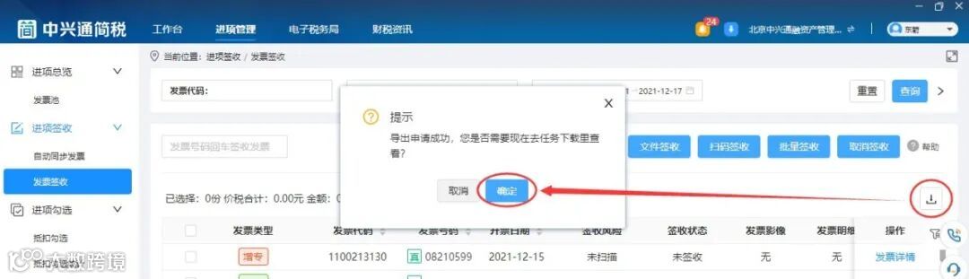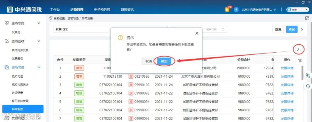 企业可根据需要导出异常发票列表,以便掌握不可抵扣的异常发票情况。
