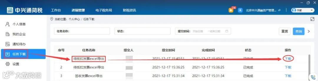 然后,在【任务下载】页面——点击【下载】,即可下载对应“异常发票excel导出”列表。