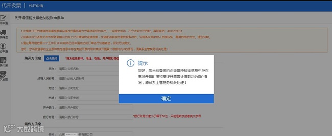 北京市电子税务局,进入代开增值税专用发票(邮寄代开和自助机代开)业务提示:您当前登陆的企业票种核定信息中存在离线时限和离线开票累计限额均为0的情况,请联系主管税务机关处理?