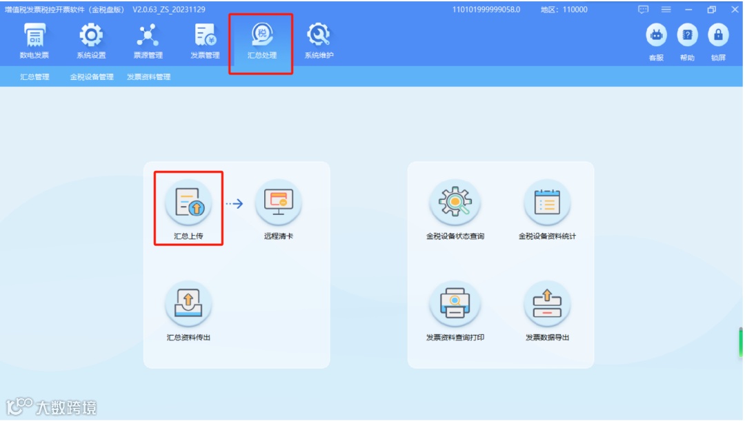 情况 2:上个月开具的发票部分或全部未上传成功,则系统无法自动完成抄报税。可在网络连接正常情况下待发票上传完成后,点击“汇总处理”——“汇总上传”按钮。