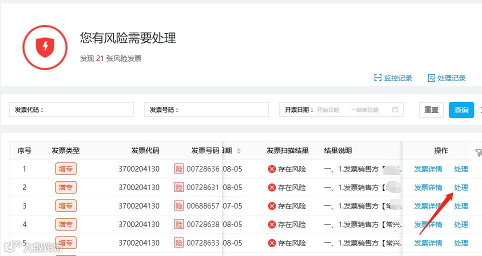 如果企业存在风险发票,可在发票详情页中,点击【发票风险】,快速定位,并排查风险异常点,再根据实际情况进行处理。