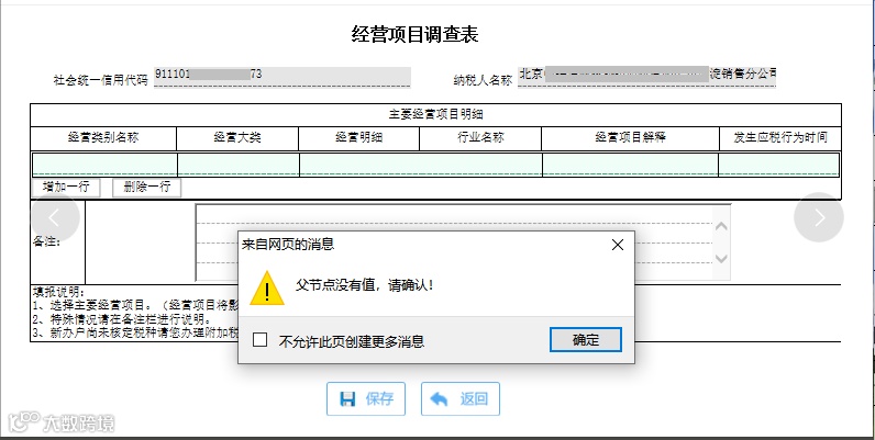 3、在电子税务局税费种认定经营项目调查表中选择“经营大类”时提示:父节点没有值,请确认!如何处理?