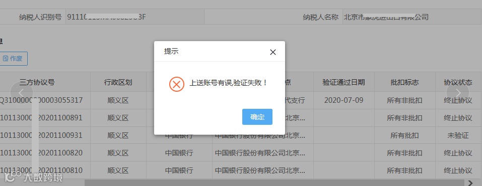 8、在电子税务局中网签三方协议时提示:该税务机关下已有同账号、同名称签约信息,验证失败!如何处理?