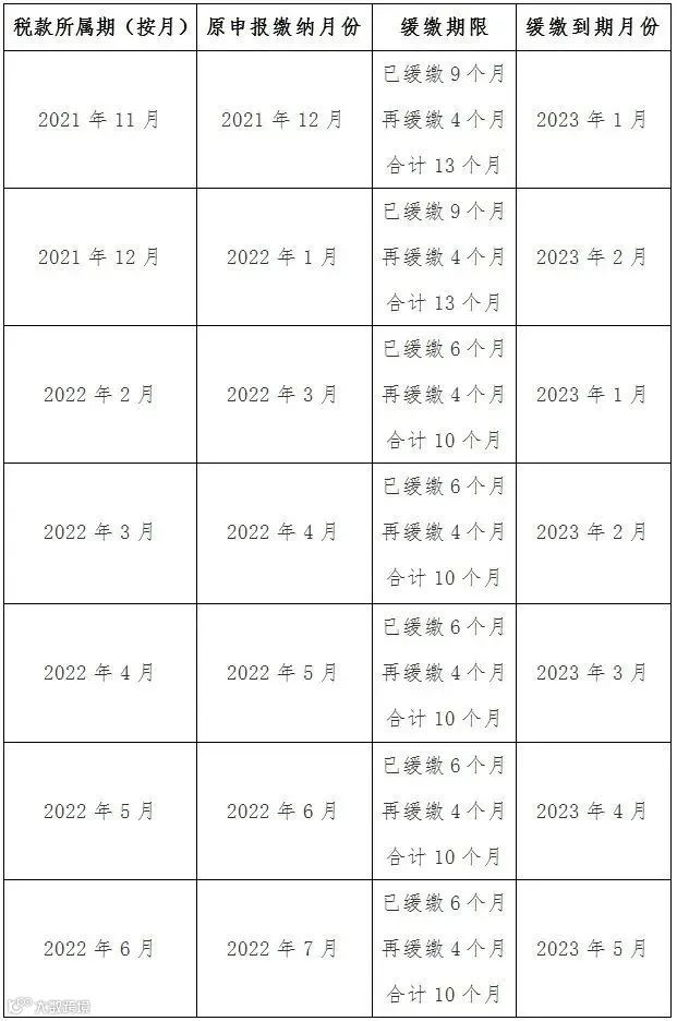 所属期是2021年11月、12月(包括按季缴纳的2021年第四季度税费)缓缴税费在延长9个月的基础上继续延长4个月(合计延长13个月),分别在2023年1月、2月入库。