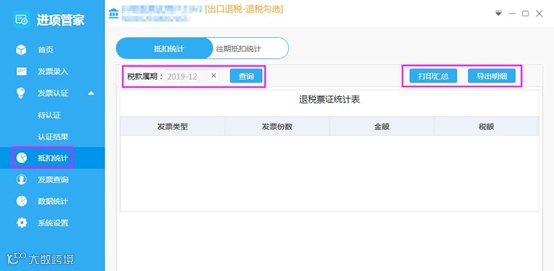 抵扣统计:进入抵扣统计菜单,可以查询统计数据,导出数据明细。