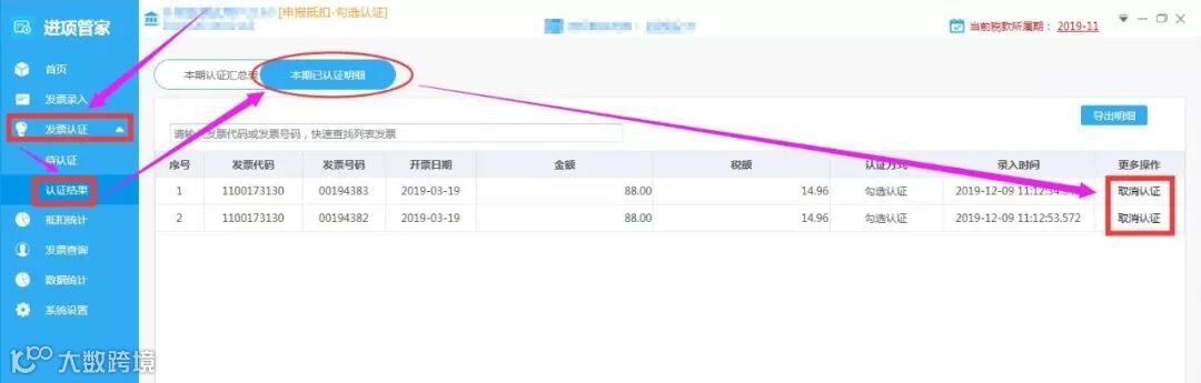 注:目前进项管家暂不支持退税勾选发票的取消认证,请谨慎操作。。