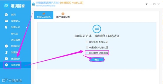 切换退税勾选方式:登录进项管家,进入系统设置菜单,切换为退税勾选方式,点击【确定】按钮(如当前为退税勾选方式界面,跳过此步骤);
