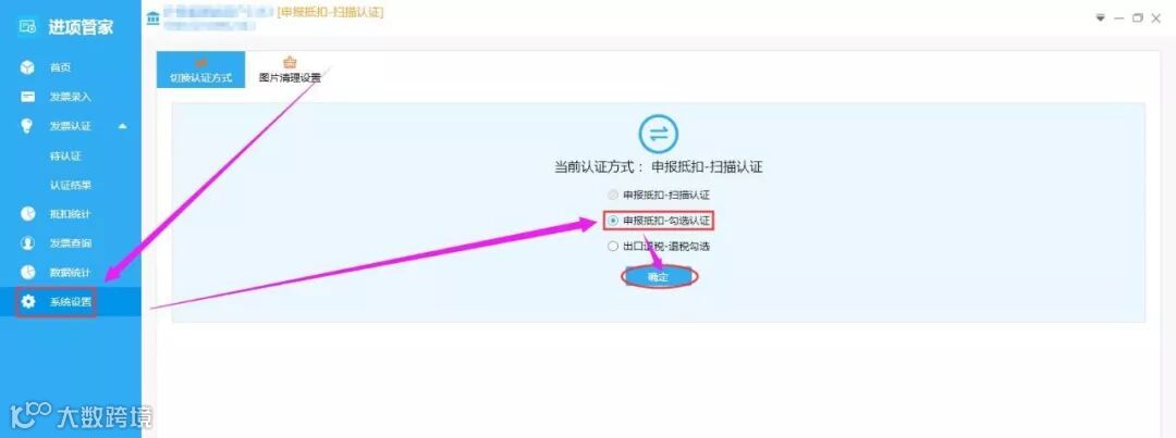 登录进项管家,进入系统设置菜单,切换为勾选认证方式,点击【确定】按钮(如当前为勾选认证方式页面,跳过此步骤);