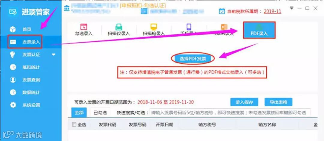 PDF录入:企业认证通行费电子发票时,进项管家支持电子发票PDF文件的直接传入和认证。