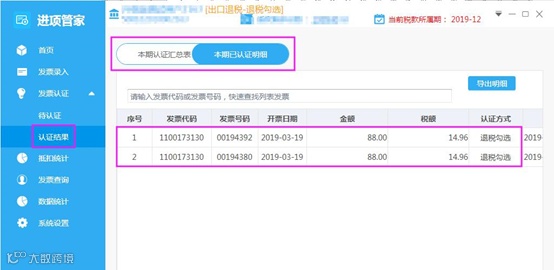 查看结果:发票确认认证成功后,自动跳转“发票认证 – 发票认证结果”界面,在“本期认证汇总表”及“本期已认证明细”界面中可以查看本期发票认证信息;