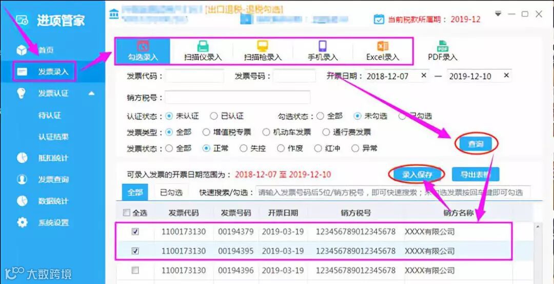 发票录入:进入发票录入菜单,退税勾选方式可选择勾选录入、扫描仪录入、扫描枪录入、手机录入、Excel录入,保存后点击【录入保存】按钮;
