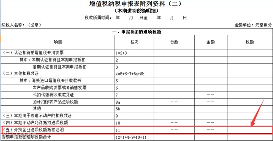 后续操作:依据《国家税务总局关于发布〈出口货物劳务增值税和消费税管理办法〉的公告》(国家税务总局公告2012年第24号)规定,外贸企业发生原记入出口库存账的出口货物转内销或视同内销货物征税的,以及已申报退(免)税的出口货物发生退运并转内销的,外贸企业应于发生内销或视同内销货物的当月向主管税务机关申请开具出口货物转内销证明。外贸企业应在取得出口货物转内销证明的下一个增值税纳税申报期内申报纳税时,以此作为进项税额的抵扣凭证使用。申报时应填写在《增值税纳税申报表附列资料表二(本期进项税额明细)》第11行“(五)外贸企业进项税额抵扣证明”中(如下图)。