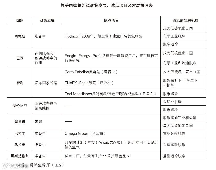在氢能领域,拉美各国的发展情况和未来规划处于不同阶段。阿根廷、巴西、智利和哥伦比亚均发布了氢工业战略,希望在未来几年成为低碳氢出口国。墨西哥、巴拉圭和乌拉圭寻求使用氢能来使工业和交通脱碳,但尚未制定发展该行业的政治战略。除了公共部门以外,私营部门也参与其中,例如阿根廷的H2Ar财团和智利的H2Chile。