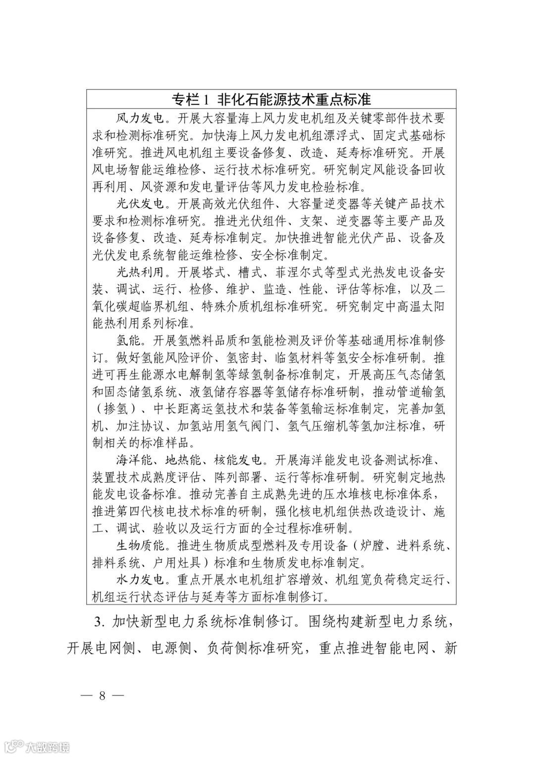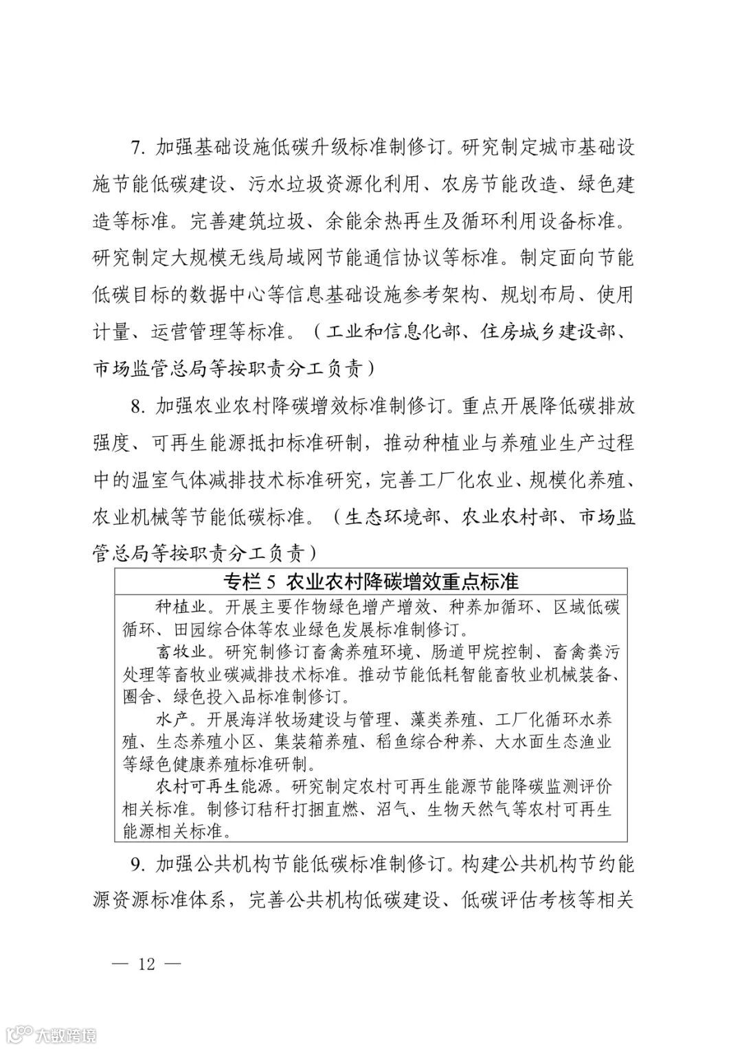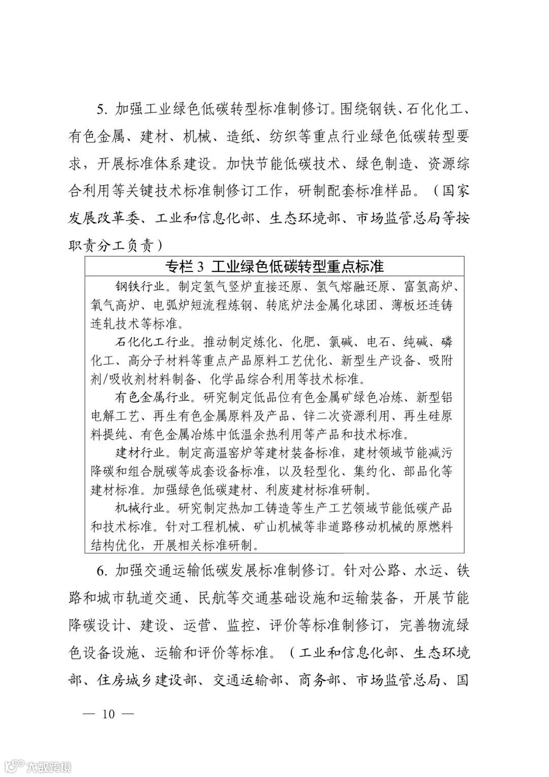 在重点领域碳减排标准方面,重点是完善节能、新能源和可再生能源、新型电力系统、化石能源清洁低碳利用、工业绿色低碳转型、交通运输低碳发展、基础设施低碳升级、农业农村降碳增效、公共机构节能低碳、资源循环利用等10个方面的标准。