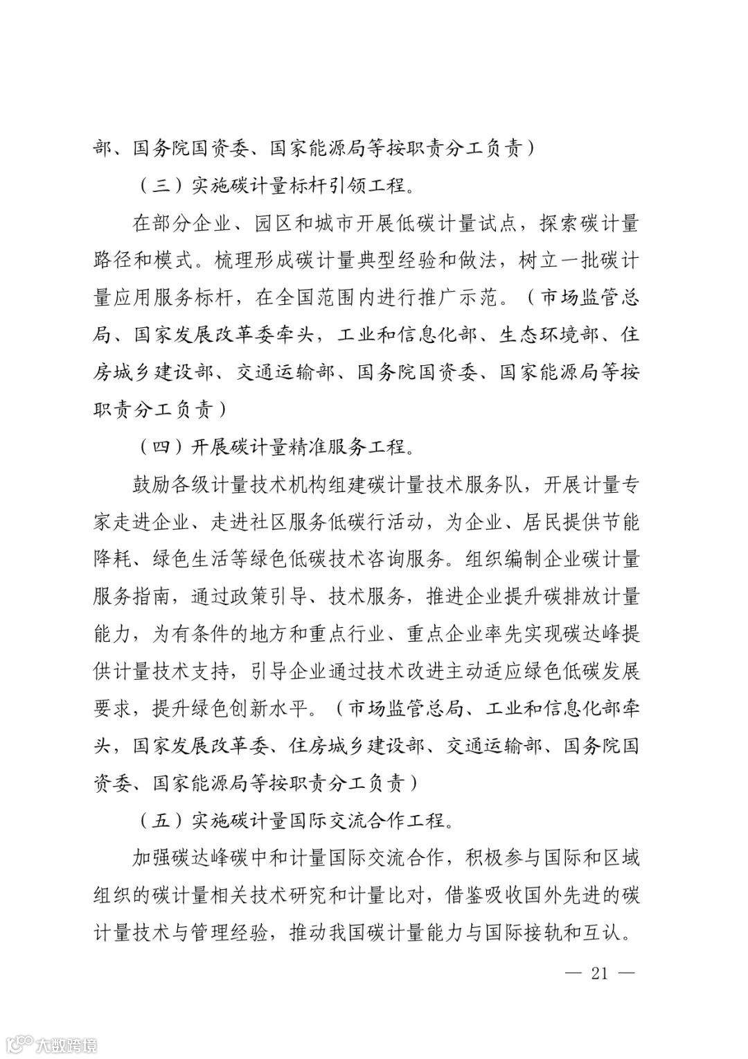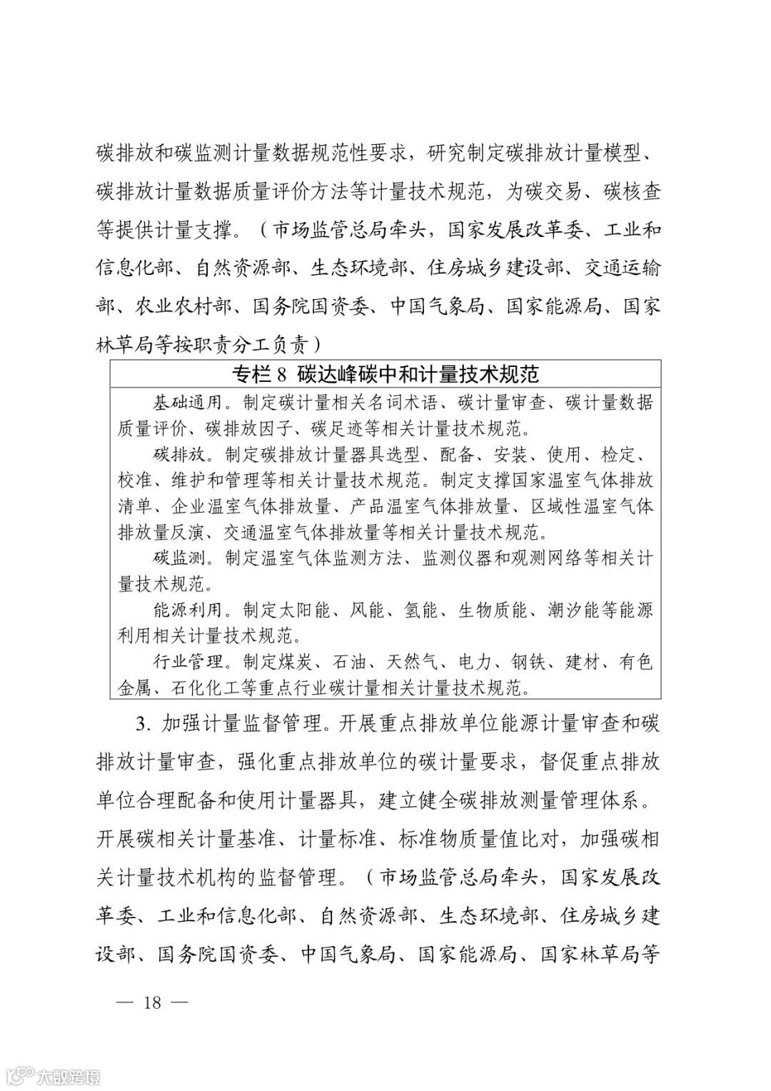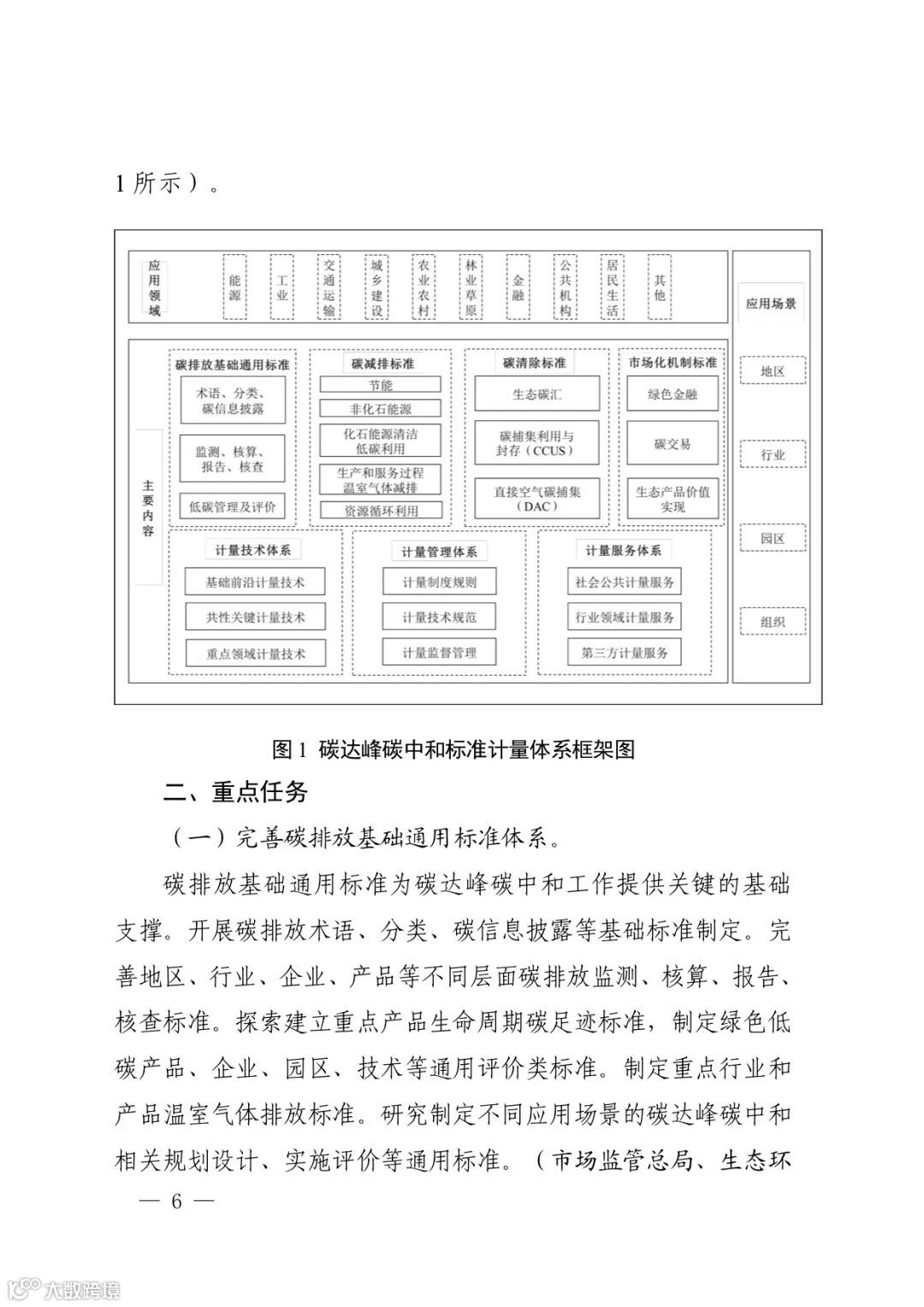 作为碳达峰碳中和“1+N”政策体系中重要文件之一,提出了完善碳排放基础通用标准体系、加强重点领域碳减排标准体系建设、加快布局碳清除标准体系、健全市场化机制标准体系、完善计量技术体系、加强计量管理体系建设、健全计量服务体系7个方面的24项重点任务,明确了实施碳计量科技创新工程、碳计量基础能力提升工程、碳计量标杆引领工程、碳计量精准服务工程、碳计量国际交流合作工程5项重点工程,开展双碳标准强基行动、百项节能降碳标准提升行动、低碳前沿技术标准引领行动、绿色低碳标准国际合作行动4项重点行动,并对协调推动各项工作落实提出相应要求。