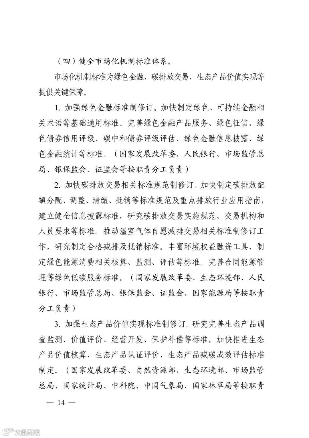 在市场化机制标准方面,重点是加强绿色金融标准、碳排放交易相关标准规范、生态产品价值实现标准等制修订,支撑碳交易、生态产品价值实现等工作,为发挥市场机制的作用提供有效标准支撑。